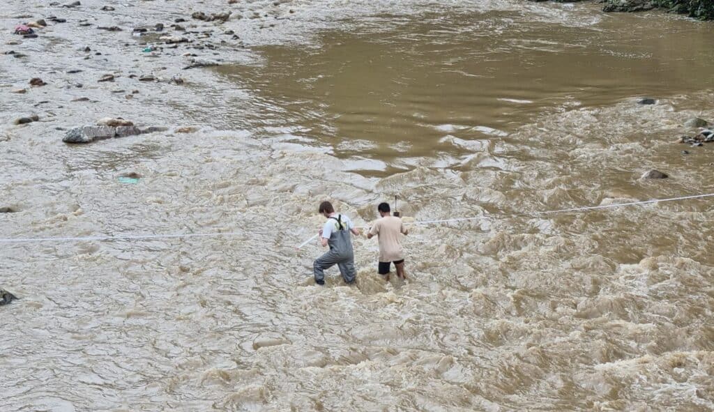 Discharge measurement at the Roshi River conducted during field monitoring activities.